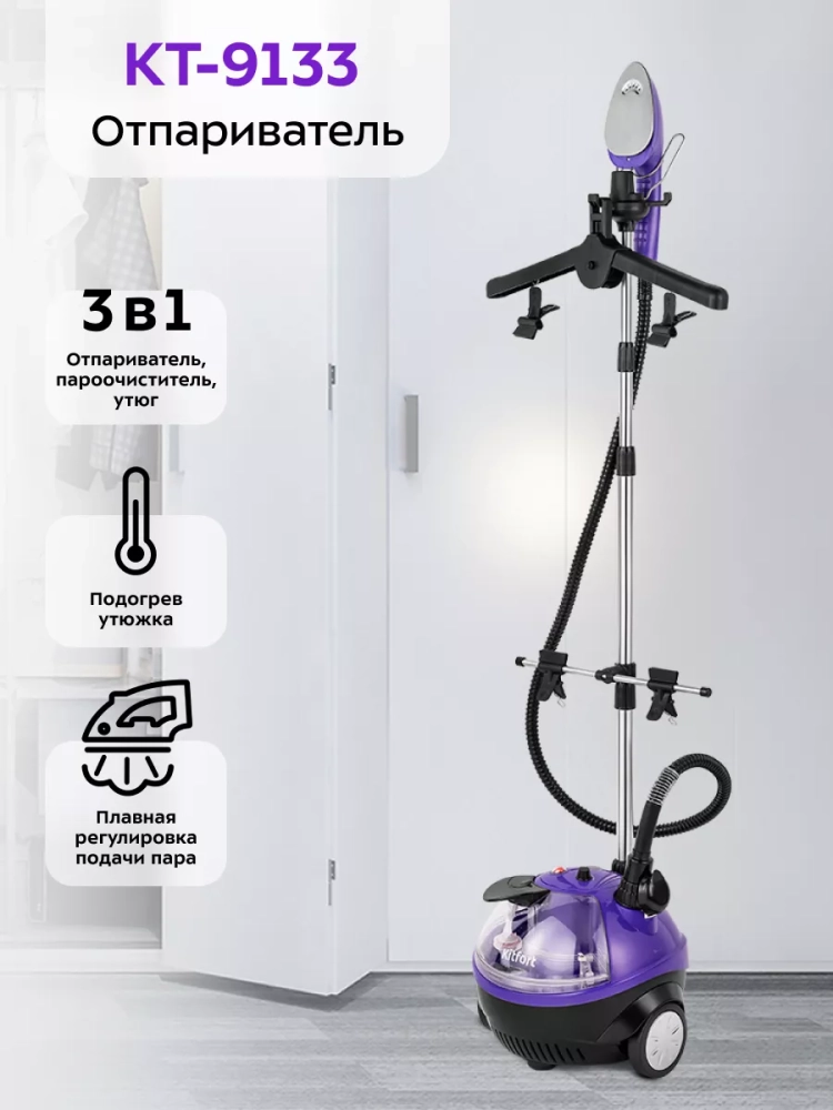 Отпариватель Kitfort «3 в 1» КТ-9133 совмещает в себе сразу три устройства: отпариватель, утюг и пароочиститель. Паровой утюжок позволяет быстро отпарить любые вещи и изделия из текстиля. Также вы можете погладить ткань с помощью утюжка для сухой глажки. А паровой пистолет поможет удалить грязь, жир и известковые отложения с различных поверхностей, убить патогенные микроорганизмы, бактерии и домашних клещей, которые могут вызывать аллергические реакции и астму.
