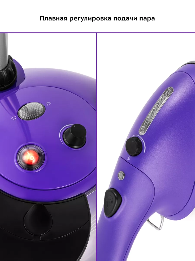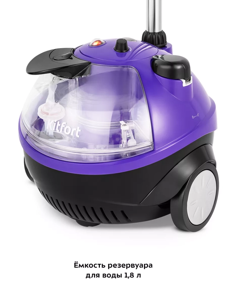 Отпариватель Китфорт «3 в 1» КТ-9133 имеет плавную регулировку подачи пара для различных типов тканей. Кнопка подачи пара и регулятор находятся и на корпусе прибора, и на паровом утюжке, что очень удобно. Крышка разъема парового шланга не допускает попадание пыли и грязи внутрь устройства, когда паровой шланг не присоединен. Отпариватель оборудован колесиками для его удобного перемещения. Также на корпусе есть ручка для переноски устройства.