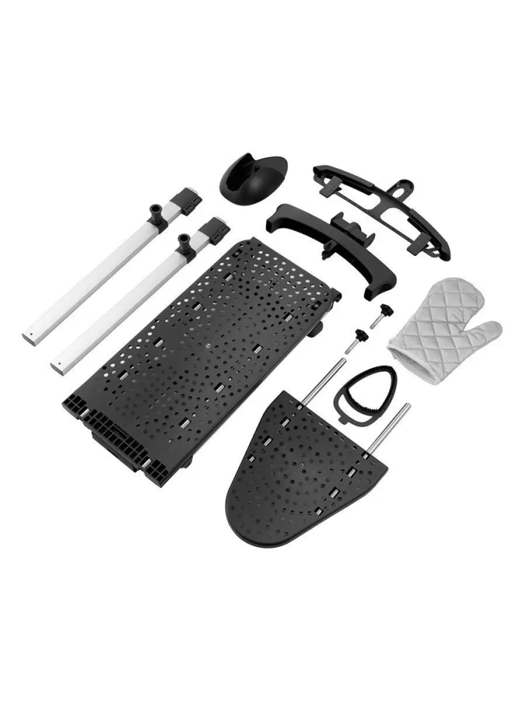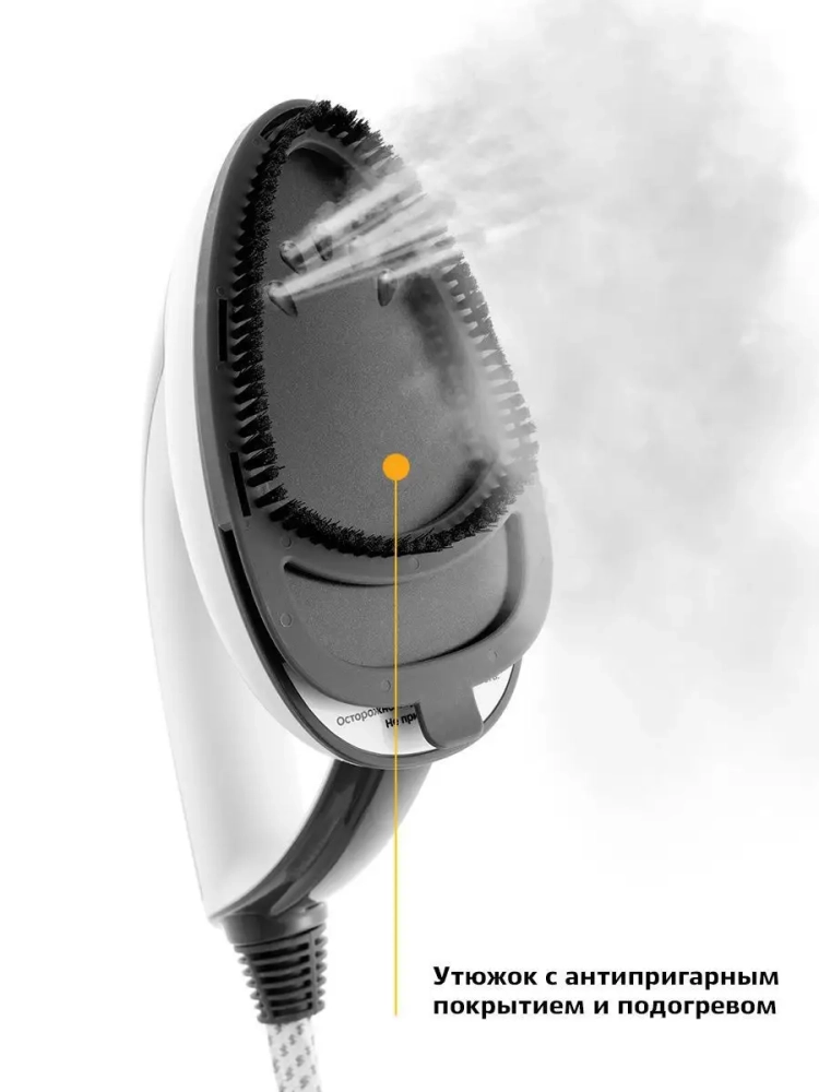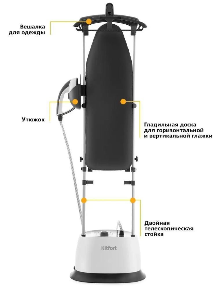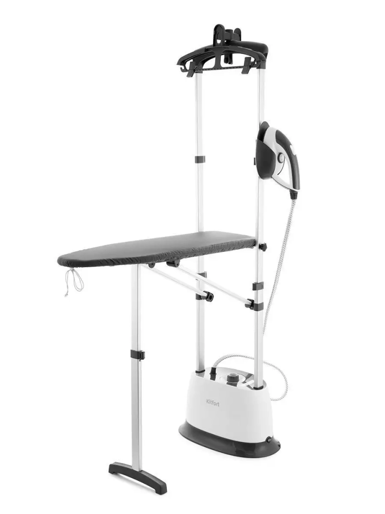 Отпариватель Kitfort КТ-940 своей конструкцией похож на паровую станцию и пароочиститель. Вода нагревается в бойлере и под давлением в 4 бара подается в утюжок с антипригарным покрытием. Встроенный подогреватель нагревает подошву утюжка до температуры 100-130 С. На утюжке есть регулятор температуры для различных типов ткани, поэтому вы можете гладить отпаривателем, как утюгом. Держатель утюжка расположен на одной из телескопических стоек. В случае возникновения в бойлере избыточного давления предохранительный клапан, встроенный в крышку бойлера, стравит пар, пока давление не опустится до безопасного уровня. Крышку бойлера невозможно открутить, пока в бойлере есть давление. Отпариватель оснащен гладильной доской, которая может устанавливаться вертикально и горизонтально. При сборке и установке гладильной доски в горизонтальном положении следите, чтобы телескопические стойки были выдвинуты до упора.