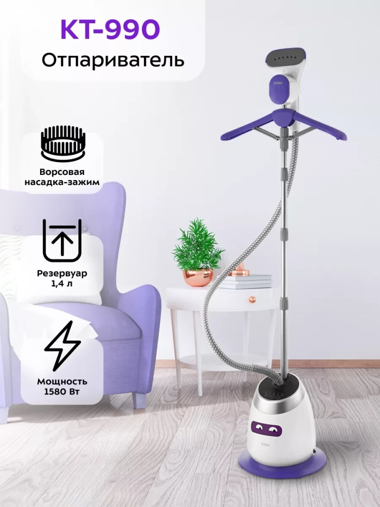КТ-990 оснащен вешалкой для одежды. Вешалка облегчает и ускоряет процесс глажки. В комплекте идет ворсовая щетка-зажим, которую можно использовать как зажим для брюк.
