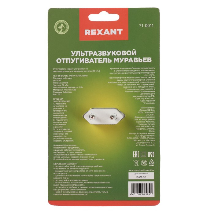 Отпугиватель муравьев Rexant 71-0011, ультразвуковой, 30 м2