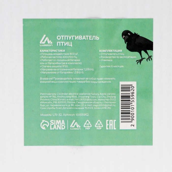 Отпугиватель птиц и других животных Luazon LRI-32, от солнечной батареи, зеленый