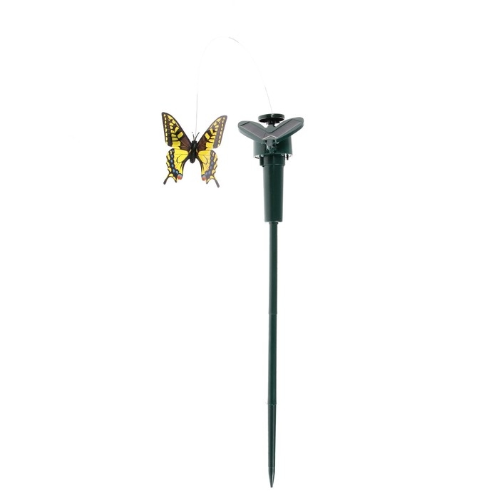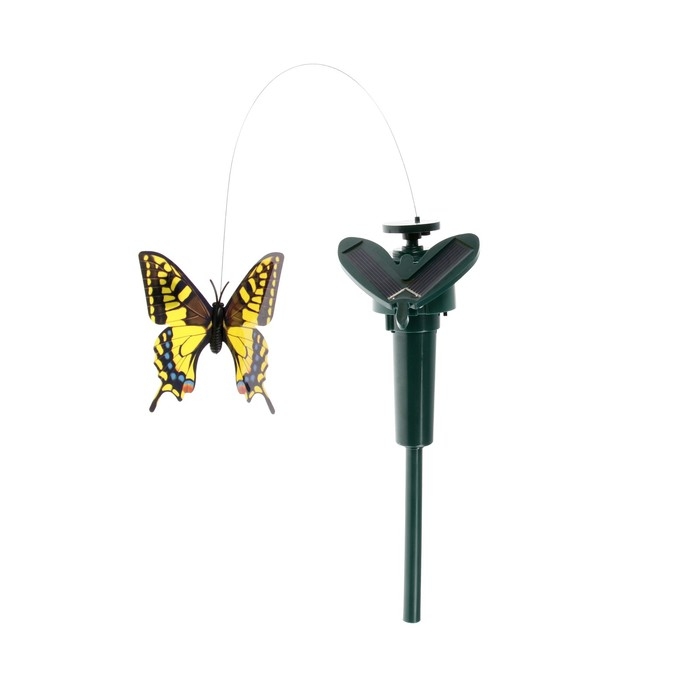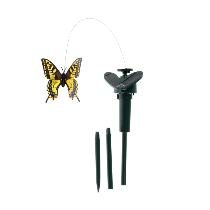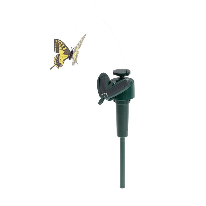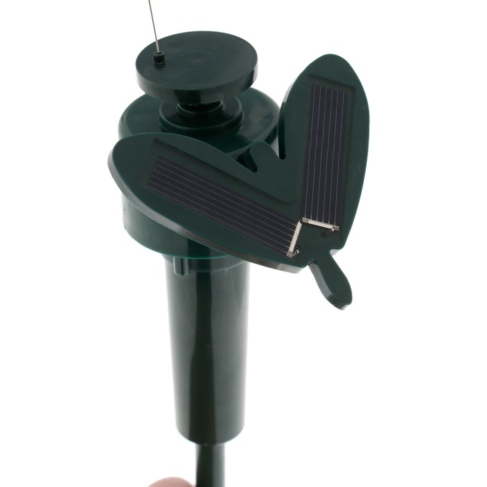 Отпугиватель птиц эффектно воздействует на летающих вредителей на участке, защищая придомовую территорию от нарушителей спокойствия и порядка. Устройство работает за счёт солнечного света или от батарейки, - перед установкой устройства выберите способ питания на корпусе. Суть работы отпугивателя проста и понятна: реалистичная фигура бабочки крутится на 360 градусов, что вкупе с шумовым воздействием отгоняет птиц.