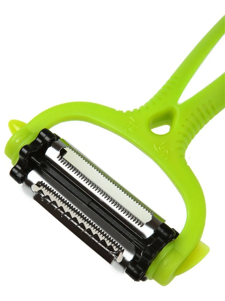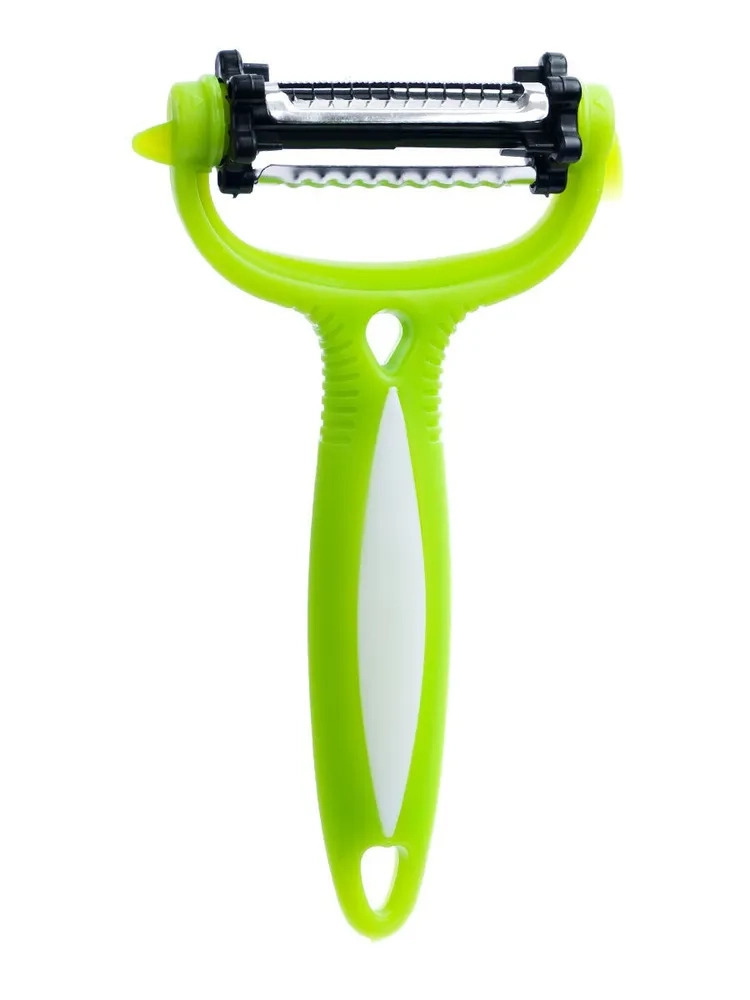 Овощечистка 3 в 1 станет прекрасным помощником на кухне. Она подойдет для чистки и шинковки овощей и фруктов и даже нарезки моркови по- корейски. Инструмент оснащен поворотной насадкой с 3-мя видами ножей, которые позволят с минимальными затратами времени тонко снять кожуру, а также быстро и красиво нарезать овощи и фрукты нужно лишь настроить овощечистку на нужное лезвие. Гладким лезвием удобно аккуратно снимать тонкую кожуру с картофеля и других твердых овощей и фруктов, мелкозубчатое лезвие идеально для очистки помидоров и других мягких плодов, а нож с крупными зубцами –лезвиями позволит нарезать соломкой овощи. Все три ножа изготовлены из нержавеющей стали и соединены в одну конструкцию. Установка нужного ножа осуществляется простым поворотом колесика-переключателя, расположенного по бокам от лезвий. Практичный кухонный гаджет подходит для использования как правой, так и левой рукой, его легко мыть в посудомоечной машине. Больше не нужно много различных громоздких инструментов для приготовления любимых блюд! Размеры овощечистки: Длина: 150 мм. Ширина: 75 мм. Ширина режущей кромки: 40 мм.