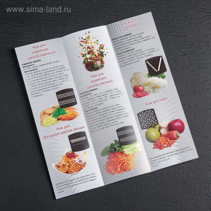 Набор для резки овощей – это компактное и многофункциональное приспособление для приготовления пищи, которое станет незаменимым помощником на любой кухне. Комплект включает в себя 7 видов насадок: ножи для картофеля фри, для шинковки капусты, для салатов, для корейской моркови двух видов и для пюре.