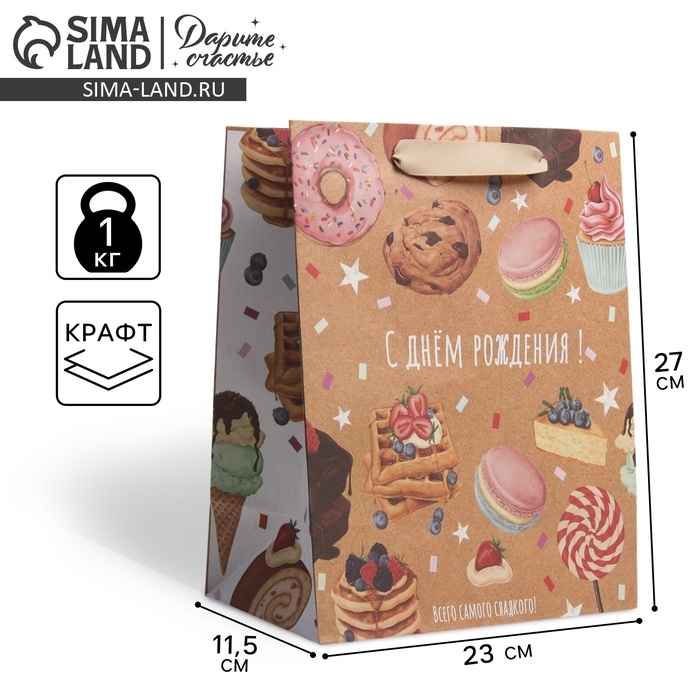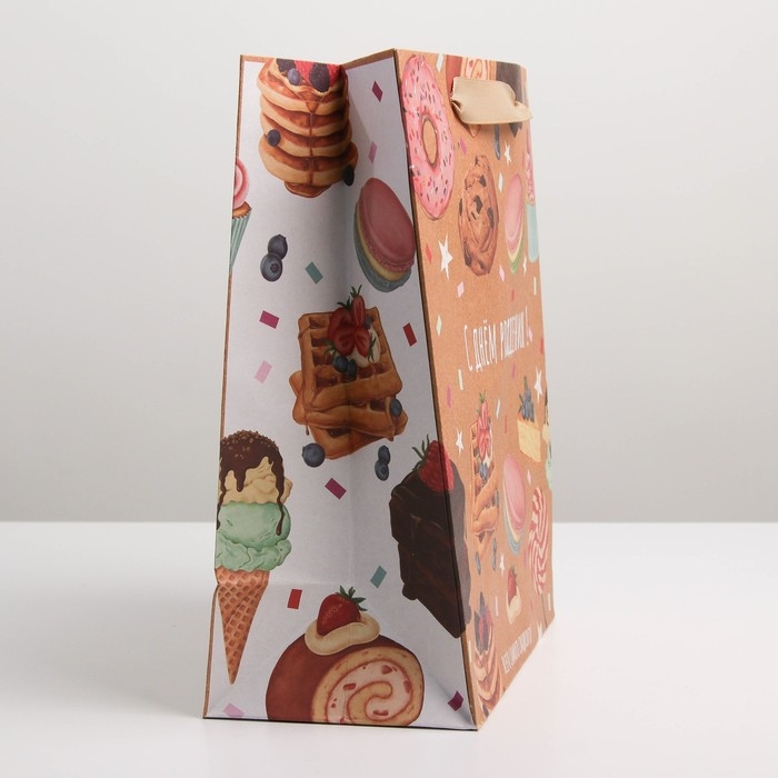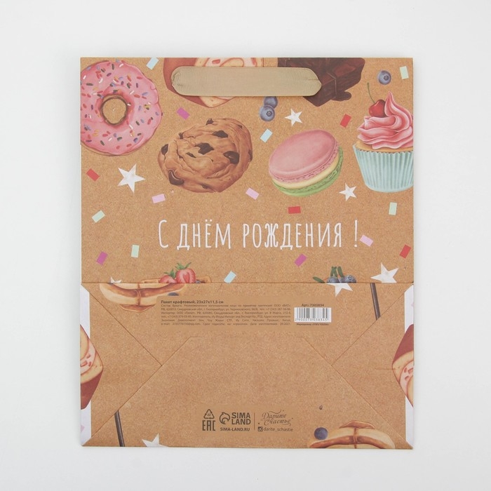 Пакет подарочный крафтовый вертикальный, упаковка, «С Днём рождения», ML 23 х 27 х 11.5 см