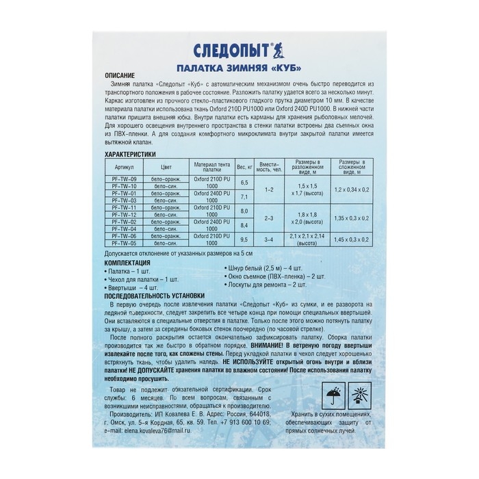 Зимняя палатка «Следопыт Куб» обеспечивает комфорт на рыбалке в зимнее время года. Благодаря системе крепления дуг «хабы» палатки очень быстро переводятся из транспортного положения в рабочее состояние. «Хаб» выполнен из морозостойкого, ударопрочного материала - нейлона (полиамида). Установить палатку можно в течение одной минуты даже одному человеку. Каркас изготовлен из прочного стеклопластикового гладкого прутка d 10 мм. Данная конструкция обеспечивает легкое раскрытие, устойчивость палатки в собранном виде при порывистом ветре. Это позволяет увеличить износостойкость каркаса, даже без использования растяжек. Палатка выполнена из ткани Oxford 240D PU1000, что обеспечивает долговечность, непродуваемость и водонепроницаемость конструкции. Внутри палатки предусмотрены карманы для хранения рыболовных мелочей. Для хорошего освещения внутреннего пространства в тент встроены окна, которые выполнены из прозрачной пленки ПВХ 500мк. А для создания комфортного микроклимата внутри закрытой палатки имеется вытяжной клапан.