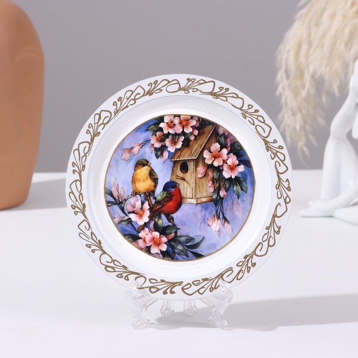 Панно-тарелка «Птицы и скворечник», белая, D = 14,8 см, лаковая миниатюра