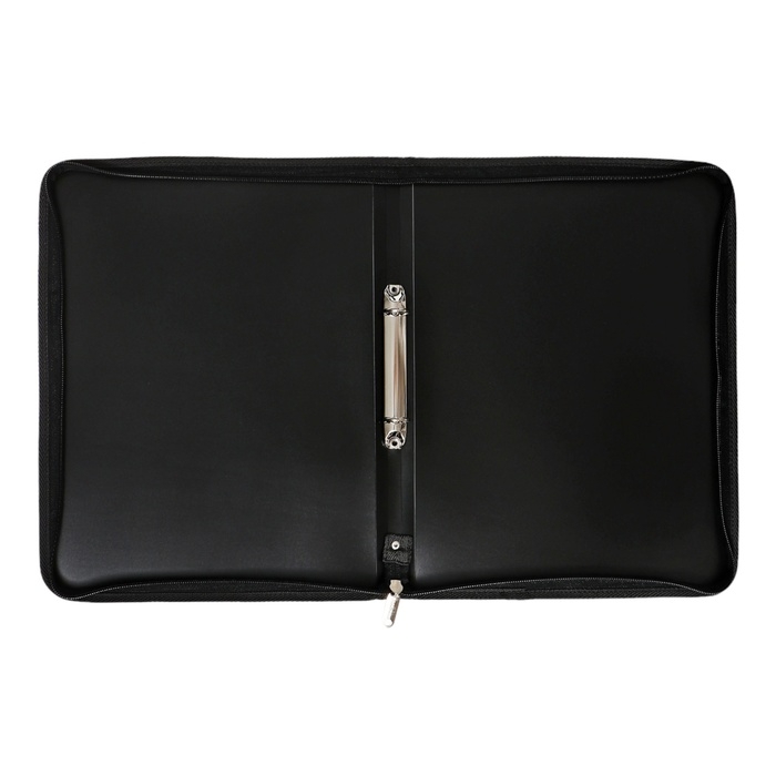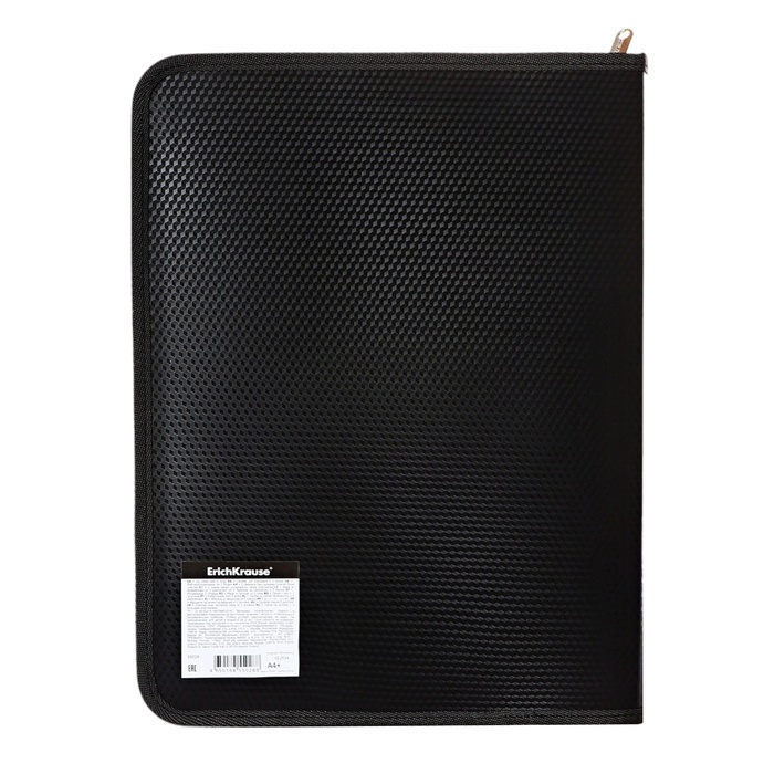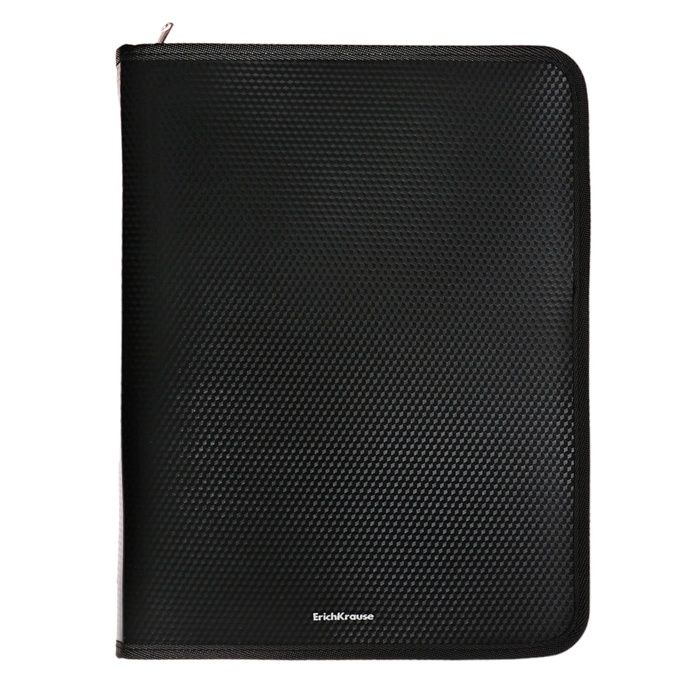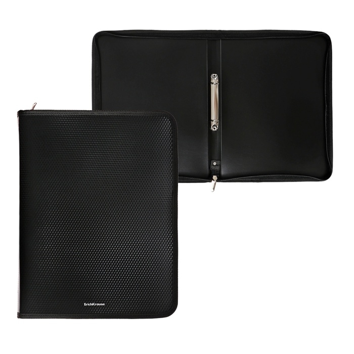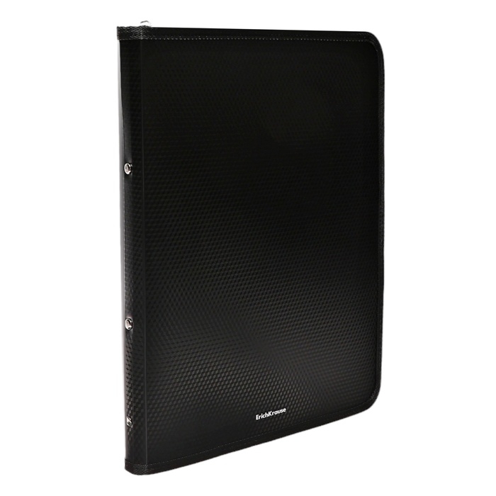 Папка на молнии с 2 кольцами формата A4+ из высококачественного пластика с текстурой поверхности "даймонд", на которой не видно отпечатков пальцев и мелких царапин. Предназначена для хранения и транспортировки документов. Надежная молния с мягким ходом обеспечивает быстрый доступ к бумагам. Цвет папки - черный. Размер - 251x334x30мм, толщина - 0.55мм. Штрих-код на каждой единице товара.