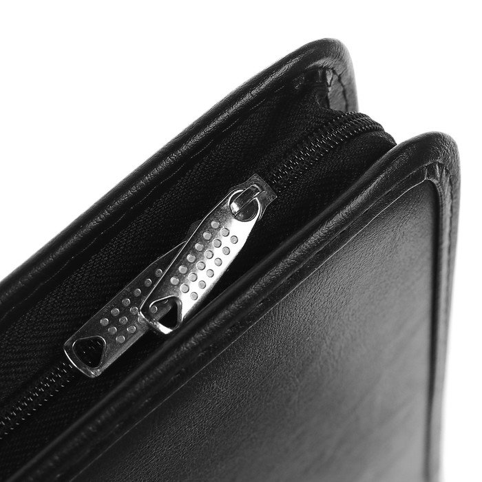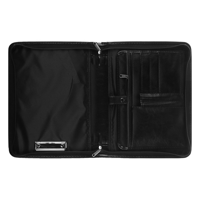 Представительная деловая папка на молнии.Изготовлена из черного К/З Люкс.Размер изделия 250 на 350 мм. Толщина папки - 50 мм.Ручка для удобсва переноса.Внутри расположено удобных, вместительных 2 кармана, откидной клапан с карманом на молнии, металлический зажим для бумаг, кармашки под везитки.