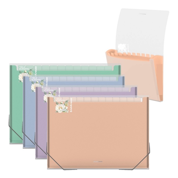Папка-картотека, А4, 12 отделений, 550 мкм, ErichKrause "Matt Pastel Bloom", на резинке, тиснение "песок", микс