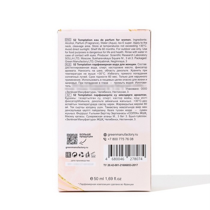 Парфюмерная вода 52 Temptation, вдохновленная ароматом Good Girl, предлагает захватывающий и соблазнительный букет, который завораживает своей сложной композицией.