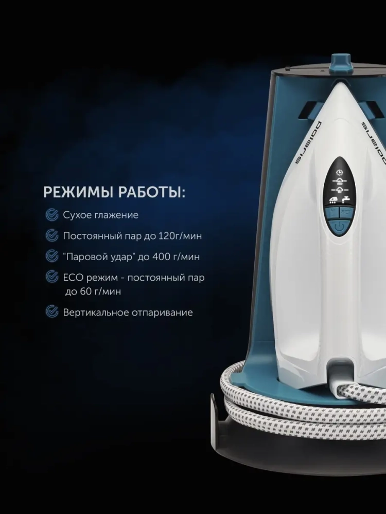 Поддержание оптимальной температуры подошвы "SMART TEMP". Время подготовки к работе: 30 сек. Электронное управление на ручке. Компактный размер - идеально для хранения. Давление пара до 7 Бар. Керамическое покрытие подошвы - PRO 5 Ceramic. Автоотключение. Мощность постоянного пара до 120 г/мин. Режимы работы: сухое глажение; постоянный пар до 120г/мин; "паровой удар" до 400 г/мин; ECO режим - постоянный пар до 60 г/мин; вертикальное отпаривание. Резервуар для воды объемом 1.5 л. Мощность: 3000 Вт.