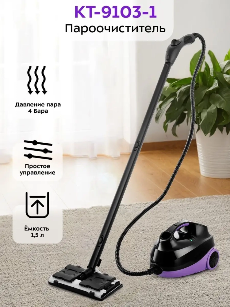 Пароочиститель Kitfort КТ-9103 - многофункциональный аппарат, способный заменить паровую швабру, дезинфектор, стеклоочиститель и отпариватель для тканей. Компактный портативный пароочиститель КТ-9103 предназначен для домашнего использования, а также использования вне дома, например в офисах, магазинах, гостиницах и отелях, для уборки интерьеров, полов и поверхностей, находящихся как внутри, так и вне помещений. Горячий пар под давлением может удалять грязь, жир и известковые отложения с различных поверхностей, убивать патогенные микроорганизмы, бактерии и пылевых клещей, которые могут вызывать аллергические реакции и астму. Пар быстро испаряется, не оставляя следов влаги на поверхности. Пароочиститель Китфорт очищает поверхности от пятен при помощи горячего пара, однако не все пятна могут быть удалены таким способом. В случаях серьезного загрязнения используйте вспомогательные насадки (ворсовую щетку и др.), а также чистящие средства, которые надо наносить на загрязнения.