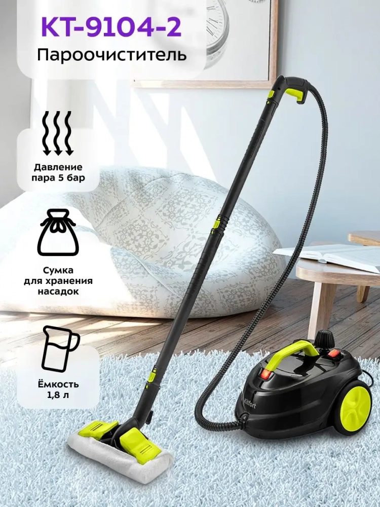 Пароочиститель Kitfort КТ-9104 - многофункциональный аппарат, способный заменить паровую швабру, дезинфектор, стеклоочиститель и отпариватель для тканей. Используя струю горячего пара, пароочиститель отлично очищает поверхности и обеспечивает деликатную глажку вещей. При этом прибор очень удобен в использовании, и работа с ним не требует от пользователя каких-то особых навыков и умений. Пароочиститель Китфорт КТ-9104 предназначен для домашнего использования, а также использования вне дома, например в офисах, магазинах, гостиницах и отелях, для уборки интерьеров, полов и поверхностей, находящихся как внутри, так и вне помещений. Прибор простой в управлении. На корпусе есть кнопка включения/выключения и индикатор готовности пара. В комплекте идет сумка, в которую можно сложить насадки. Горячий пар под давлением может удалять грязь, жир и известковые отложения с различных поверхностей, убивать патогенные микроорганизмы, бактерии и пылевых клещей, которые могут вызывать аллергические реакции и астму.