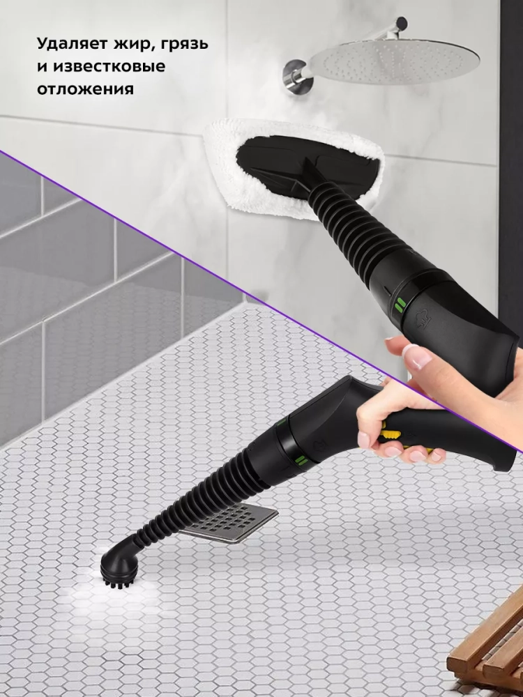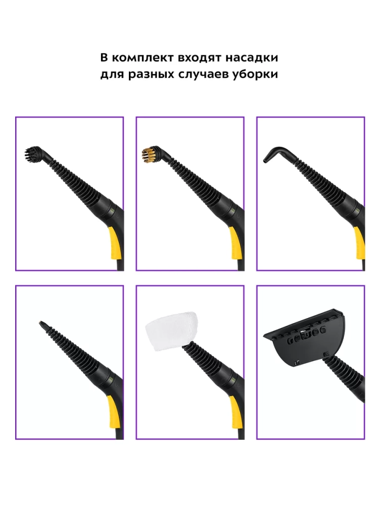 На корпусе пароочистителя есть ручка для переноски. Колеса позволяют с легкостью перемещать пароочиститель, не поднимая его. Большое количество насадок в комплекте поможет очистить труднодоступные или сильнозагрязненные поверхности.