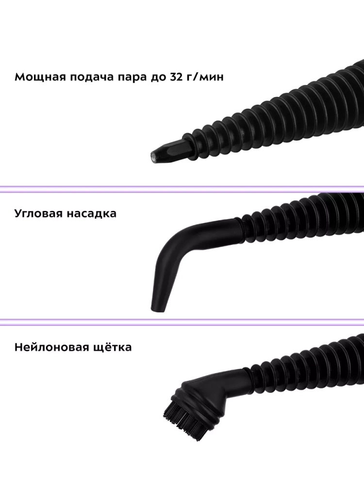 Прибор безопасен для здоровья человека и не приносит вреда окружающей среде. Пароочиститель компактный и легкий. На корпусе есть ручка для переноски.