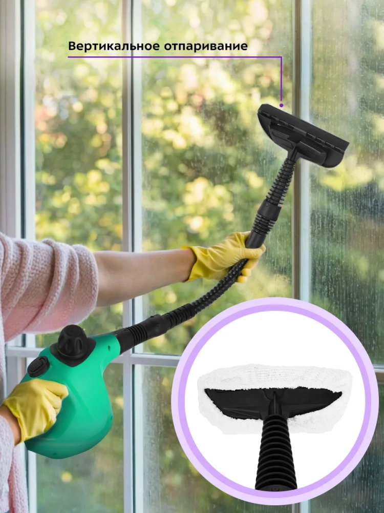 Пароочиститель очищает поверхности от пятен при помощи горячего пара, однако не все пятна могут быть удалены таким способом. В случаях серьезного загрязнения используйте нейлоновую круглую щетку, а также чистящие средства, которые надо наносить на загрязнения. Для очистки окон, зеркал и кафельной плитки используется насадка с резиновым скребком. Чтобы отпаривать одежду и чистить обивку мягкой мебели в комплекте есть тряпка для отпаривания, которая надевается на насадку для отпаривания. Благодаря наличию парового шланга есть возможность очистить труднодоступные места. Угловая насадка справится с загрязнениями в таких труднодоступных местах, как углы и радиаторы отопления.