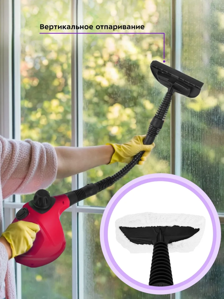 Пароочиститель очищает поверхности от пятен при помощи горячего пара, однако не все пятна могут быть удалены таким способом. В случаях серьезного загрязнения используйте нейлоновую круглую щетку, а также чистящие средства, которые надо наносить на загрязнения. Для очистки окон, зеркал и кафельной плитки используется насадка с резиновым скребком. Чтобы отпаривать одежду и чистить обивку мягкой мебели в комплекте есть тряпка для отпаривания, которая надевается на насадку для отпаривания. Благодаря наличию парового шланга есть возможность очистить труднодоступные места. Угловая насадка справится с загрязнениями в таких труднодоступных местах, как углы и радиаторы отопления.