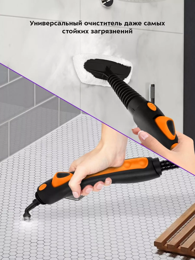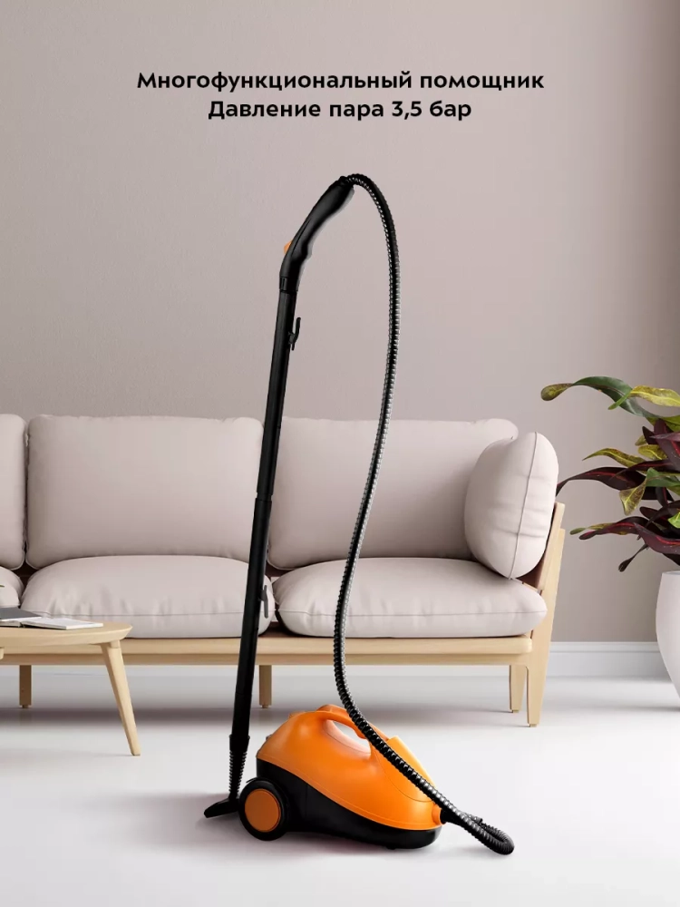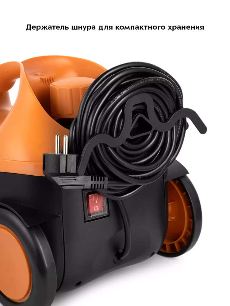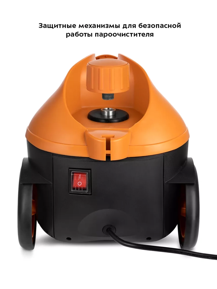 На корпусе пароочистителя есть ручка для переноса. Колеса позволяют с легкостью перемещать пароочиститель, не поднимая его. Паровой пистолет можно вставить в специальный отсек на корпусе пароочистителя для более удобного хранения прибора. Большое количество насадок в комплекте поможет очистить труднодоступные или сильнозагрязненные поверхности.