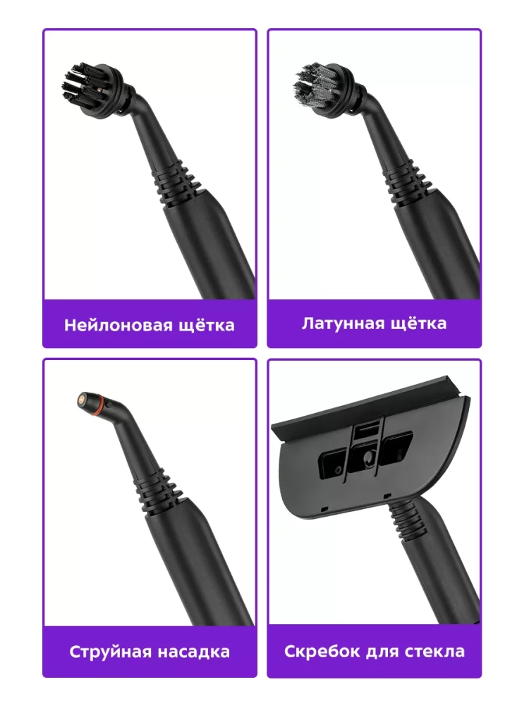 На корпусе пароочистителя есть ручка для переноса. Колеса позволяют с легкостью перемещать пароочиститель, не поднимая его. Пароочиститель очищает поверхности от пятен при помощи горячего пара, однако не все пятна могут быть удалены таким способом. В случаях сильного загрязнения используйте вспомогательные насадки из комплекта, а также чистящие средства, которые надо наносить на загрязнения. Большое количество насадок в комплекте поможет очистить труднодоступные или сильнозагрязненные поверхности.