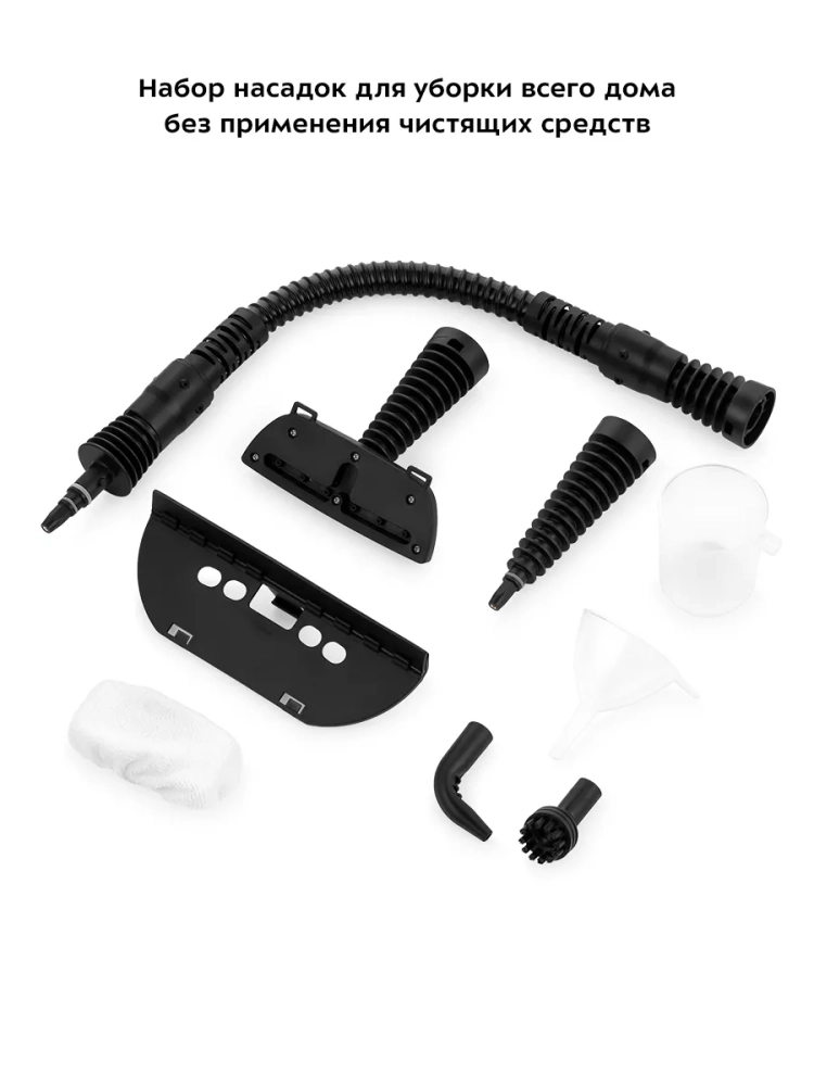 В случаях серьезного загрязнения используйте нейлоновую круглую щетку, а также чистящие средства, которые надо наносить на загрязнения. Для очистки окон, зеркал и кафельной плитки используется насадка с резиновым скребком. Чтобы отпарить одежду и чистить обивку мягкой мебели, в комплекте есть тряпка для отпаривания, которая надевается на насадку для отпаривания. Благодаря наличию парового шланга есть возможность очистить труднодоступные места. Угловая насадка справится с загрязнениями в таких труднодоступных местах, как углы и радиаторы отопления.