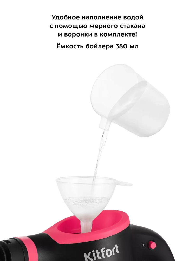 В устройство удобно наливать воду благодаря наличию воронки и мерного стакана.