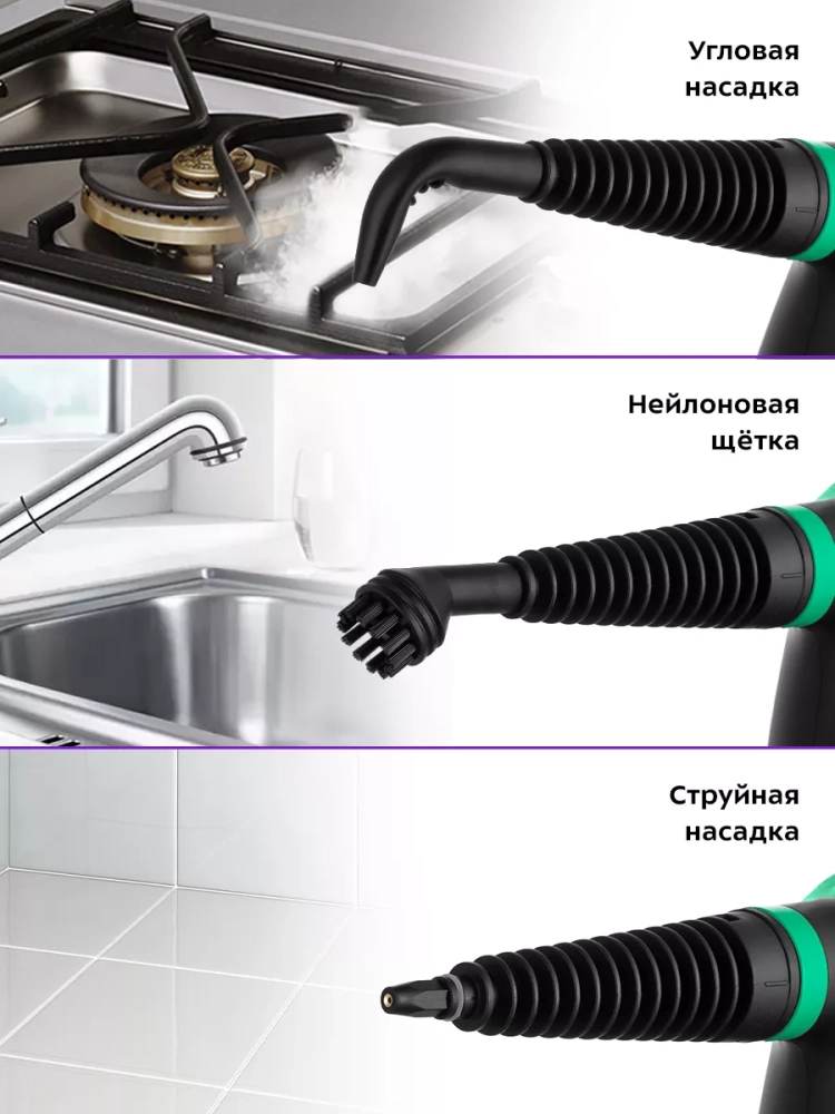 В случаях серьезного загрязнения используйте нейлоновую круглую щетку, а также чистящие средства, которые надо наносить на загрязнения. Для очистки окон, зеркал и кафельной плитки используется насадка с резиновым скребком. Чтобы отпарить одежду и чистить обивку мягкой мебели, в комплекте есть тряпка для отпаривания, которая надевается на насадку для отпаривания. Благодаря наличию парового шланга есть возможность очистить труднодоступные места. Угловая насадка справится с загрязнениями в таких труднодоступных местах, как углы и радиаторы отопления.