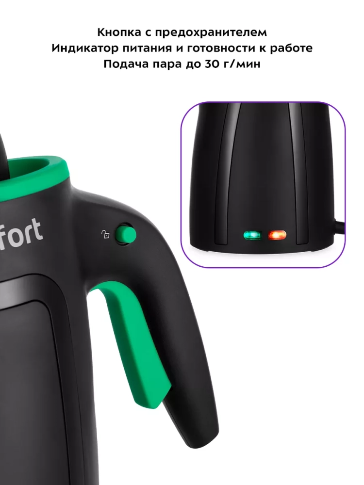 Прибор безопасен для здоровья человека и не приносит вреда окружающей среде. Пароочиститель компактный и легкий. На корпусе есть ручка для переноски.