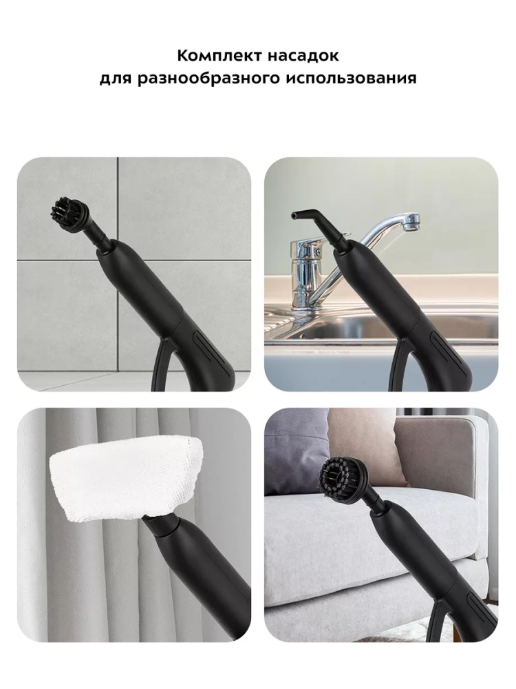 Пароочиститель очищает поверхности от пятен при помощи горячего пара, однако не все пятна могут быть удалены таким способом. В случаях сильного загрязнения используйте вспомогательные насадки из комплекта, а также чистящие средства, которые надо наносить на загрязнения. Большое количество насадок в комплекте поможет очистить труднодоступные или сильнозагрязненные поверхности.