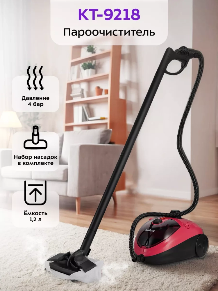 Пароочиститель Kitfort КТ-9218 предназначен для уборки интерьеров, полов и поверхностей, выдерживающих влагу и высокую температуру, а также для отпаривания тканей.