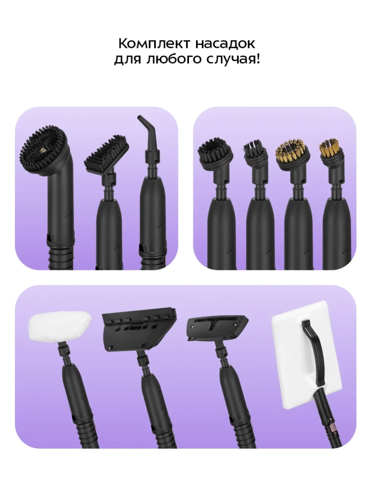 Большое кол-во насадок в комплекте поможет очистить труднодоступные или сильнозагрязненные поверхности. Чтобы аксессуары не потерялись, в комплекте есть сумка, куда их удобно убрать на хранение.