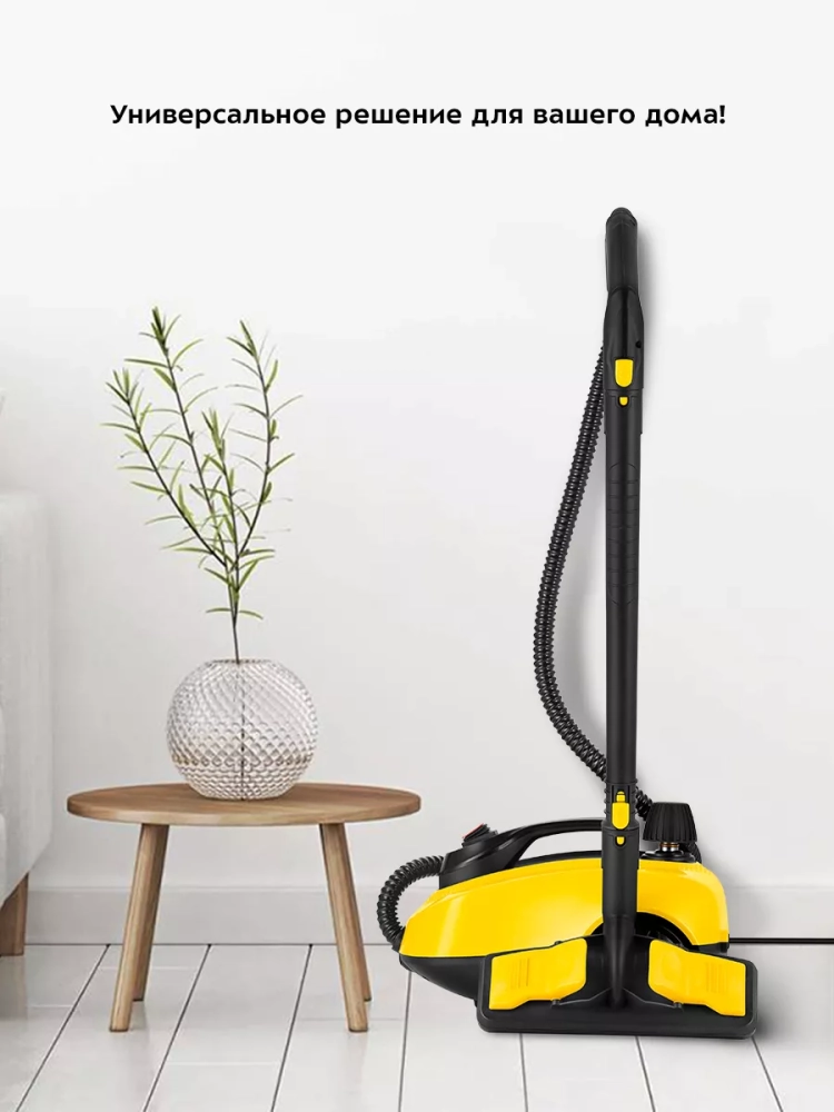 Пароочиститель оснащен ручкой для переноски. Колеса позволяют с легкостью перемещать пароочиститель во время уборки, не поднимая его. Большое количество насадок в комплекте поможет очистить труднодоступные или сильнозагрязненные поверхности.