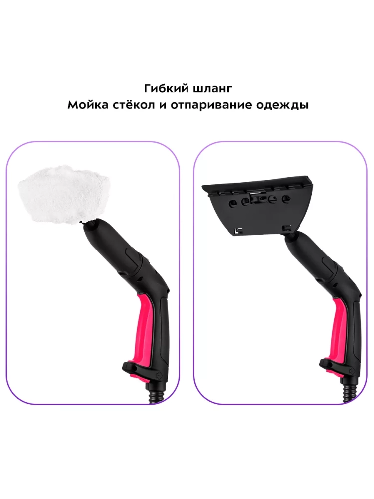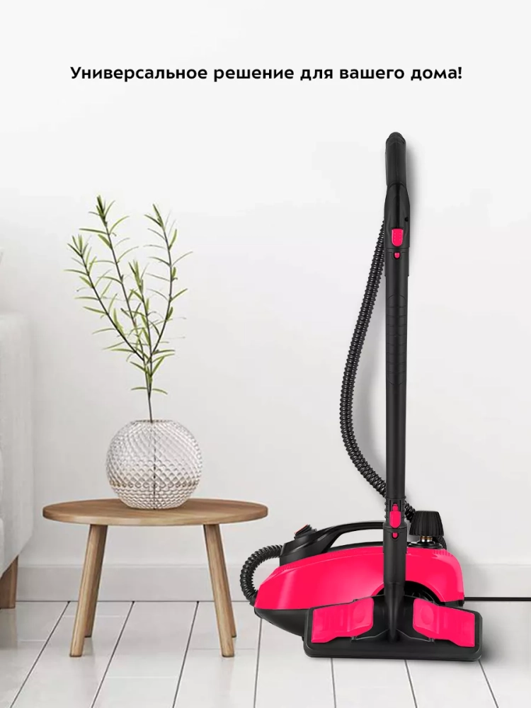 Пароочиститель оснащен ручкой для переноски. Колеса позволяют с легкостью перемещать пароочиститель во время уборки, не поднимая его. Большое количество насадок в комплекте поможет очистить труднодоступные или сильнозагрязненные поверхности.