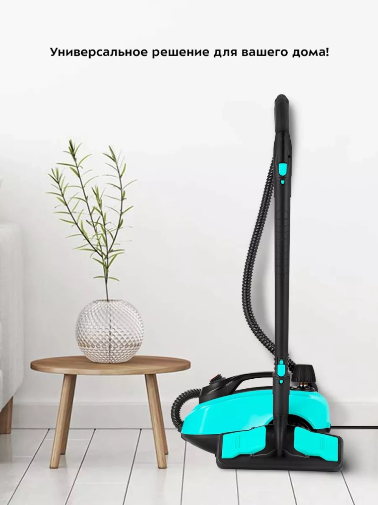 Пароочиститель оснащен ручкой для переноски. Колеса позволяют с легкостью перемещать пароочиститель во время уборки, не поднимая его. Большое количество насадок в комплекте поможет очистить труднодоступные или сильнозагрязненные поверхности.
