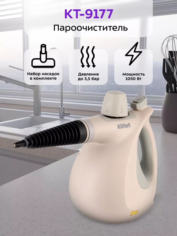 Пароочиститель Kitfort КТ-9177 — многофункциональный прибор, способный заменить дезинфектор, стеклоочиститель и отпариватель. Используя струю горячего пара, пароочиститель отлично очищает поверхности и обеспечивает деликатную глажку вещей. Прибор очень удобен в использовании и работа с ним не требует особых навыков и умений.