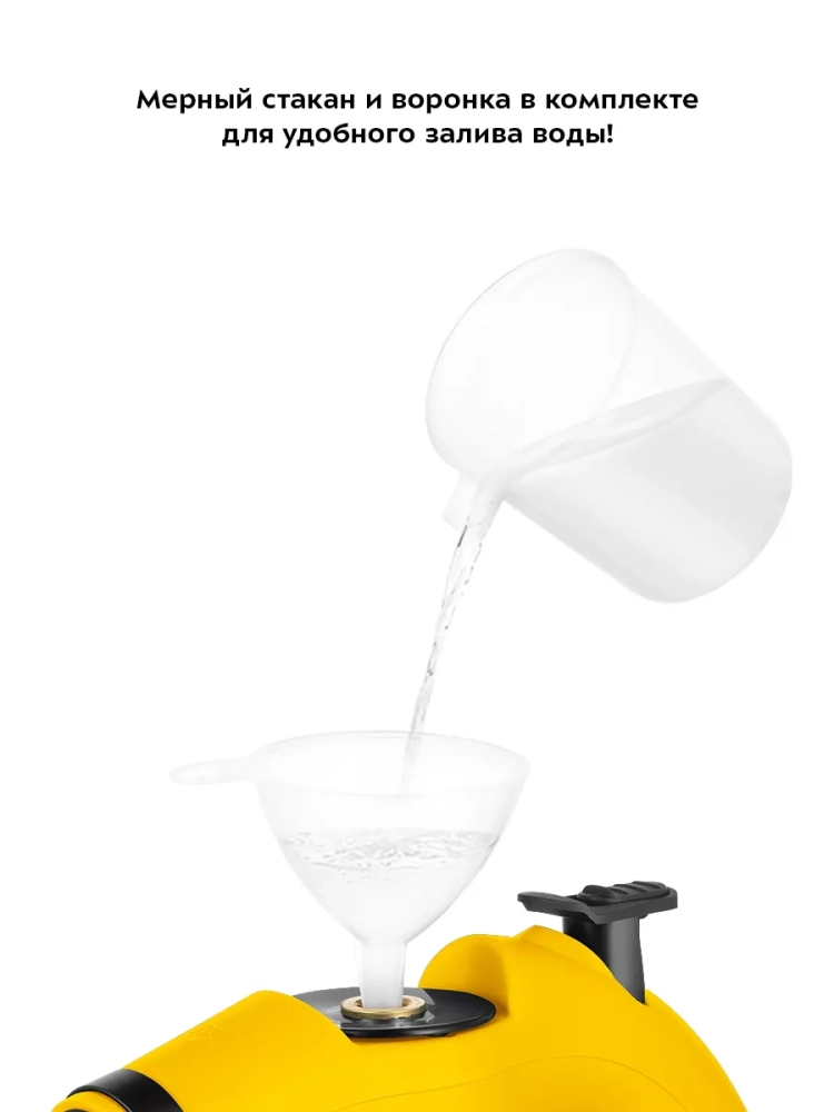 В устройство удобно наливать воду благодаря наличию воронки и мерного стакана.