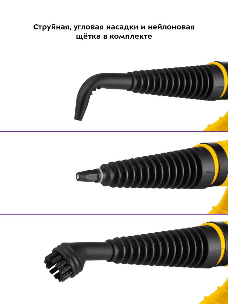 Пароочиститель очищает поверхности от пятен при помощи горячего пара, однако не все пятна могут быть удалены таким способом. Большое количество насадок в комплекте поможет очистить труднодоступные или сильнозагрязненные поверхности.