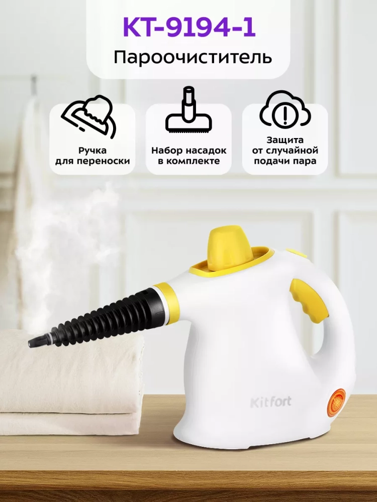 Пароочиститель Kitfort КТ-9194 — многофункциональный прибор, способный заменить паровую швабру, дезинфектор, стеклоочиститель и отпариватель для тканей. Используя струю горячего пара, пароочиститель отлично очищает поверхности и обеспечивает деликатную глажку вещей. Прибор очень удобен в использовании и работа с ним не требует особых навыков и умений.