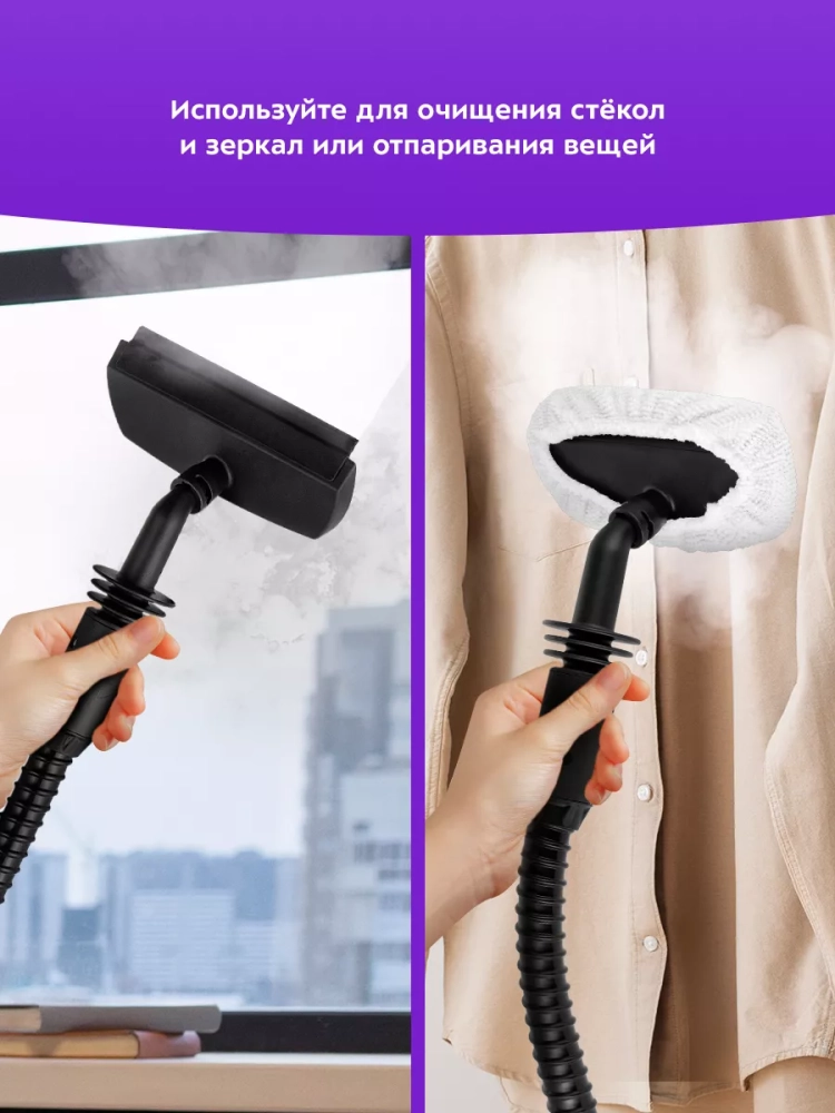 Пароочиститель оснащен универсальными насадками, которые позволяют адаптировать его для уборки различных поверхностей. В комплект входят насадки для очистки мебели, окон, одежды и даже авто. Специальная насадка-щетка обеспечивает эффективную очистку мягких поверхностей, таких как мебель и одежда. Пароочиститель также может использоваться как паровая швабра для напольных покрытий, обеспечивая идеальную чистоту и здоровье в вашем доме.