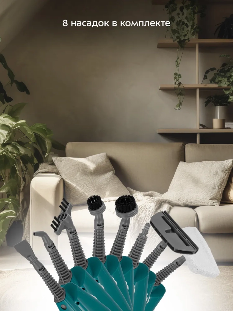Конструкция «2 в 1» предусматривает использование ручного модуля паровой швабры с насадками без присоединения к нему удлинительной трубки с рукояткой. Большое количество насадок в комплекте поможет очистить труднодоступные или сильнозагрязненные поверхности. Скребок и нейлоновые щетки эффективно очищают сложные загрязнения с помощью механического воздействия. Для очистки окон, зеркал и кафельной плитки используется насадка для отпаривания со скребком. Если на данную насадку надеть тряпку для отпаривания, насадка может использоваться для отпаривания одежды и чистки обивки мягкой мебели. Струйная и угловая насадки помогут очистить щели и углы.
