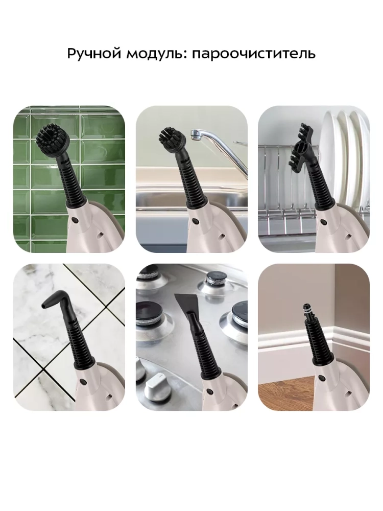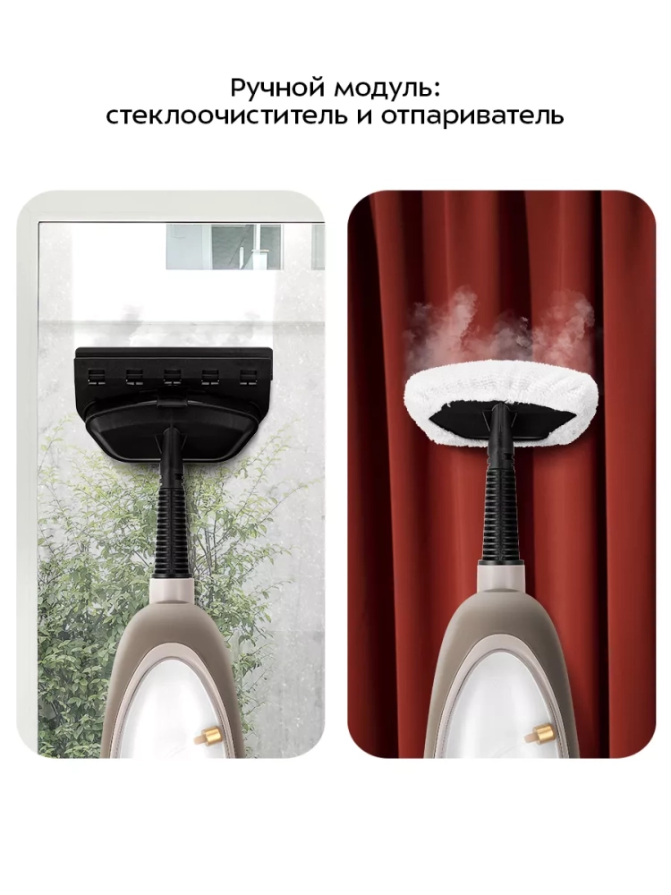 Конструкция «2 в 1» предусматривает использование ручного модуля паровой швабры с насадками без присоединения к нему удлинительной трубки с рукояткой. Большое количество насадок в комплекте поможет очистить труднодоступные или сильнозагрязненные поверхности. Скребок и нейлоновые щетки эффективно очищают сложные загрязнения с помощью механического воздействия. Для отпаривания одежды и чистки обивки мягкой мебели используется насадка для отпаривания с тряпкой для отпаривания. Для очистки окон, зеркал и кафельной плитки на насадку для отпаривания устанавливается насадка с резиновым скребком. Струйная и угловая насадки помогут очистить щели и углы.