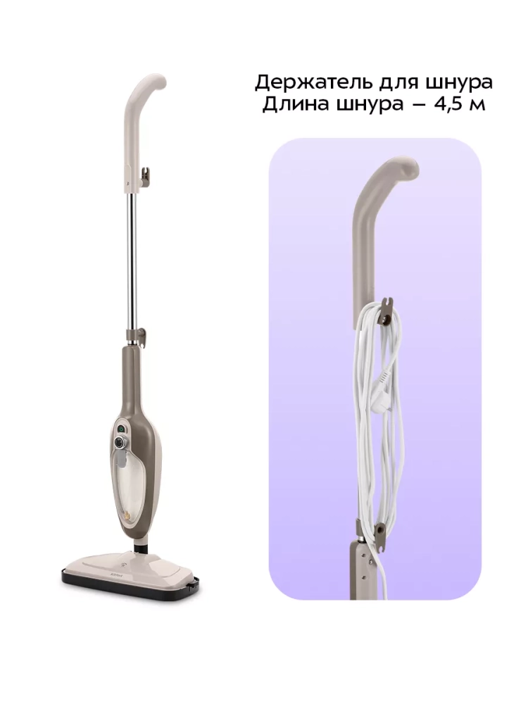 Паровая швабра обладает функцией вертикальной парковки и большим углом наклона при уборке, который поможет убрать пространство под мебелью. Напольная насадка закреплена на специальном шарнире, что делает швабру очень маневренной и облегчает уборку.