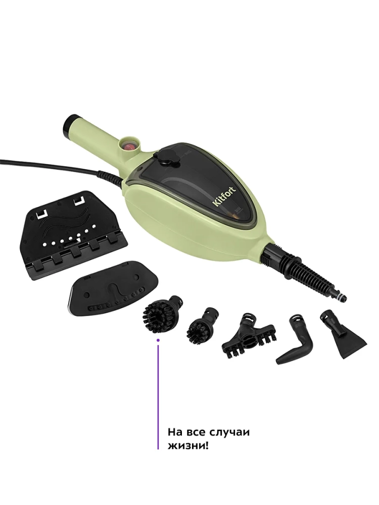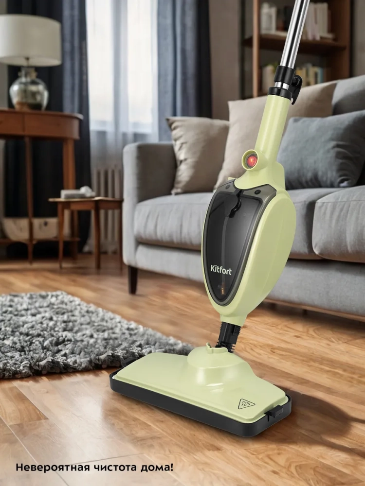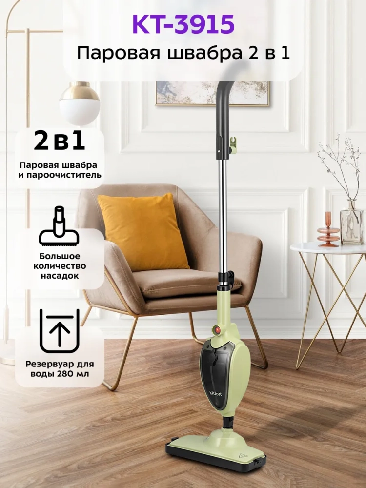 Паровая швабра Kitfort КТ-3915 — универсальное устройство, которое поможет избавиться от пыли и грязи с помощью мощной струи пара, а также продезинфицирует обрабатываемую поверхность. При помощи специальных насадок из комплекта КТ-3915 очистит напольные покрытия, раковину и плиту на кухне, зеркала, окна и плитку в ванной без каких-либо химических средств, исключительно паром.