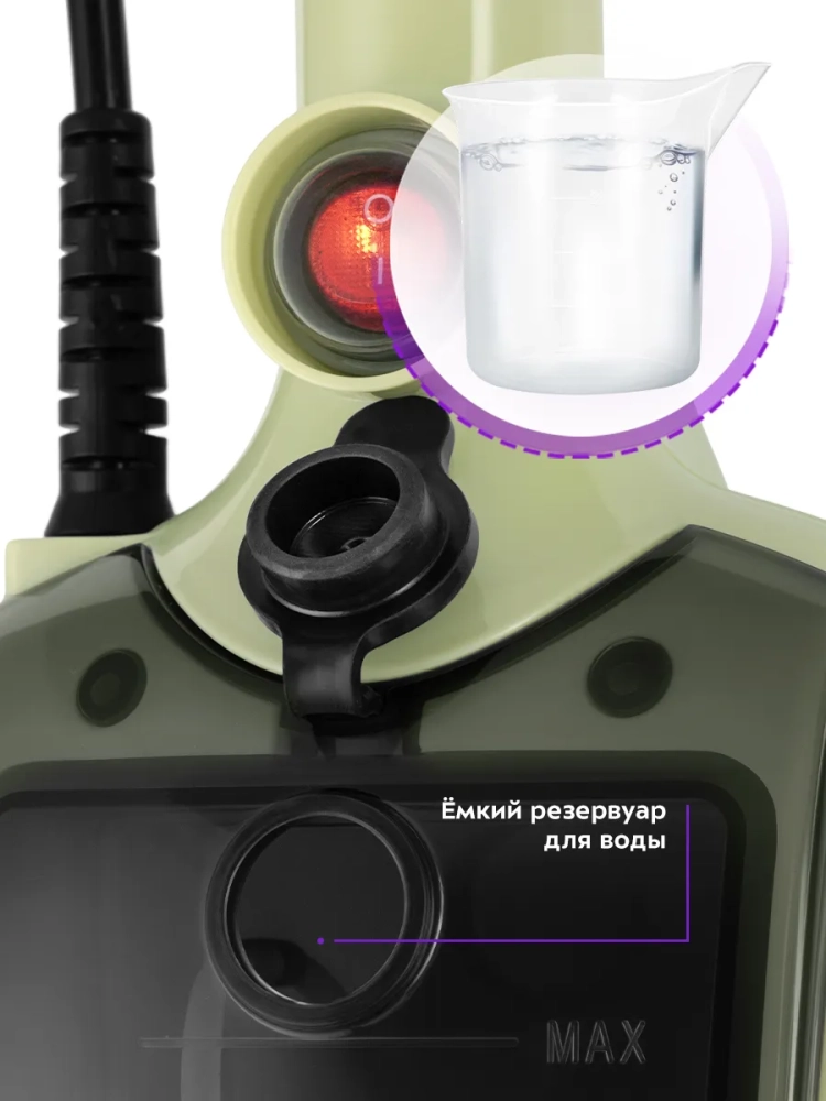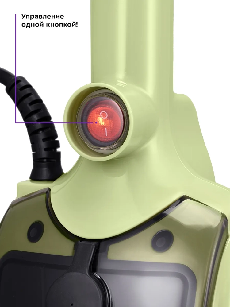 Паровая швабра обладает функцией вертикальной парковки и большим углом наклона при уборке, который поможет убрать пространство под мебелью. Напольная насадка закреплена на специальном шарнире, что делает швабру очень маневренной и облегчает уборку.
