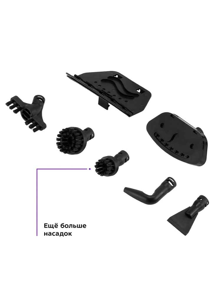 Конструкция «2 в 1» предусматривает использование ручного модуля паровой швабры с насадками без присоединения к нему удлинительной трубки с рукояткой. Большое количество насадок в комплекте поможет очистить труднодоступные или сильнозагрязненные поверхности. Струйная и угловая насадки помогут очистить щели и углы. Скребок и нейлоновые щетки эффективно очищают сложные загрязнения с помощью механического воздействия. Для отпаривания одежды и чистки обивки мягкой мебели используется насадка для отпаривания с тряпкой для отпаривания. Для очистки окон, зеркал и кафельной плитки на насадку для отпаривания устанавливается насадка с резиновым скребком.