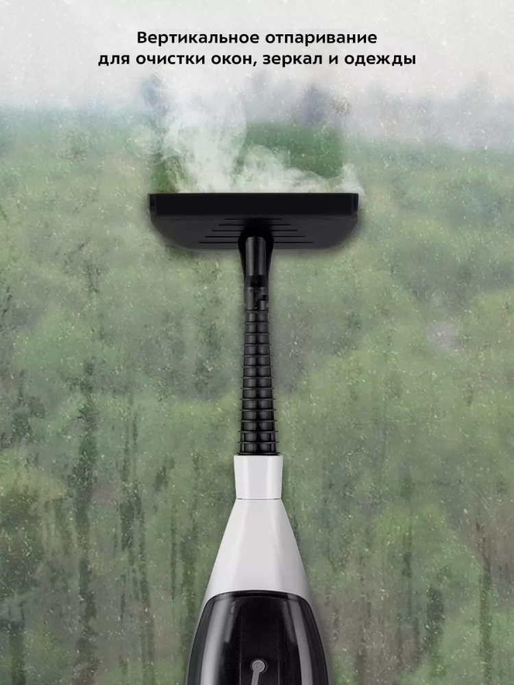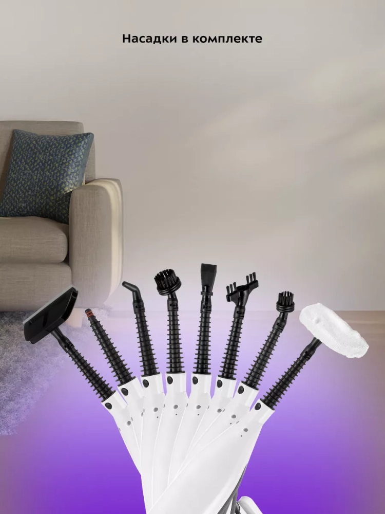 Большое количество насадок в комплекте поможет очистить труднодоступные или сильнозагрязненные поверхности. Для очистки окон, зеркал и кафельной плитки используется насадка с резиновым скребком. Чтобы отпаривать одежду и чистить обивку мягкой мебели, в комплекте есть тряпка для отпаривания. Струйная и угловая насадки помогут очистить щели и углы.