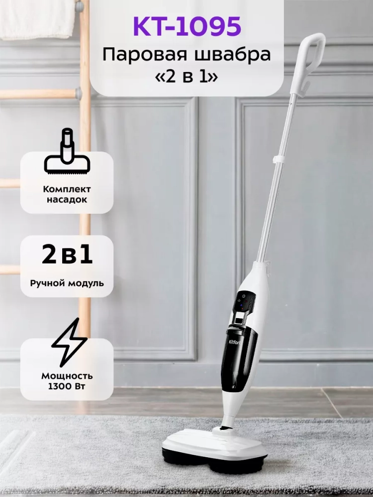 Паровая швабра «2 в 1» Kitfort КТ-1095 — универсальное устройство, которое поможет избавиться от пыли и грязи с помощью мощной струи пара, а также продезинфицирует обрабатываемую поверхность.