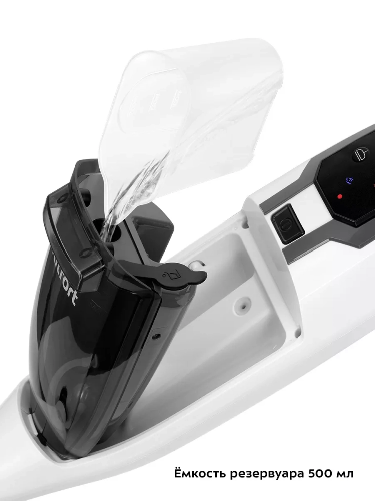 Паровая швабра КТ-1095 оснащена съемным резервуаром для воды емкостью 500 мл, что позволяет производить непрерывную уборку в течение 19–30 минут. Три уровня подачи пара позволяют настраивать интенсивность работы устройства.