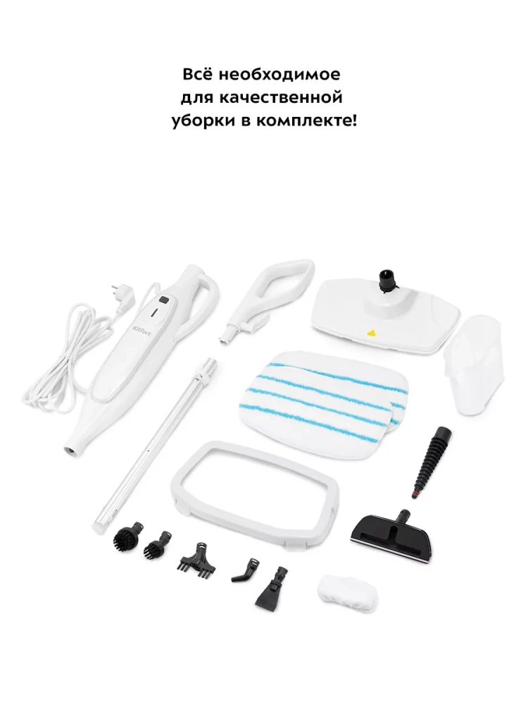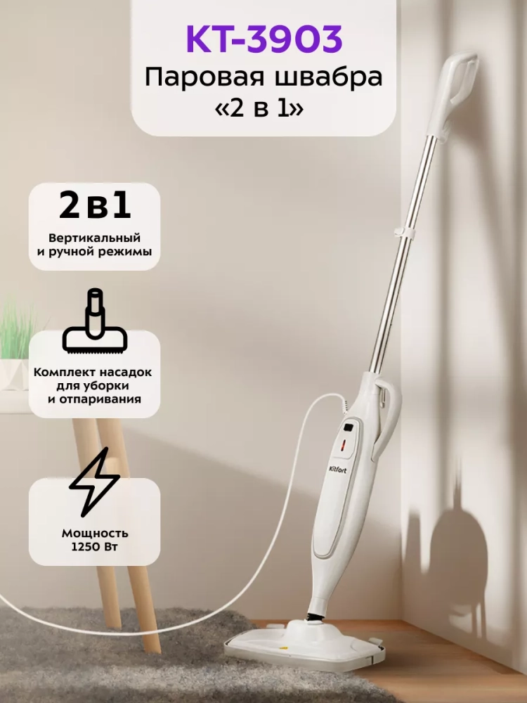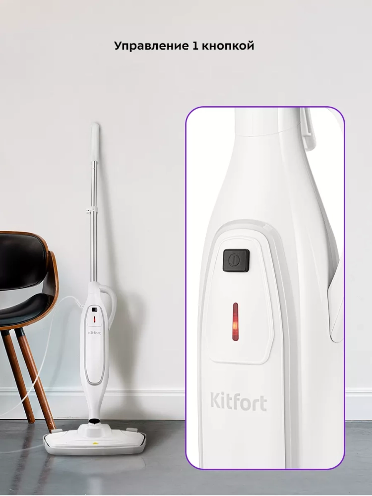 Паровая швабра Kitfort КТ-3903 — универсальное устройство, которое поможет избавиться от пыли и грязи с помощью мощной струи пара, а также продезинфицирует обрабатываемую поверхность. Паровая швабра очистит раковину и плиту на кухне, зеркала и мебель без каких-либо химических средств, исключительно паром.